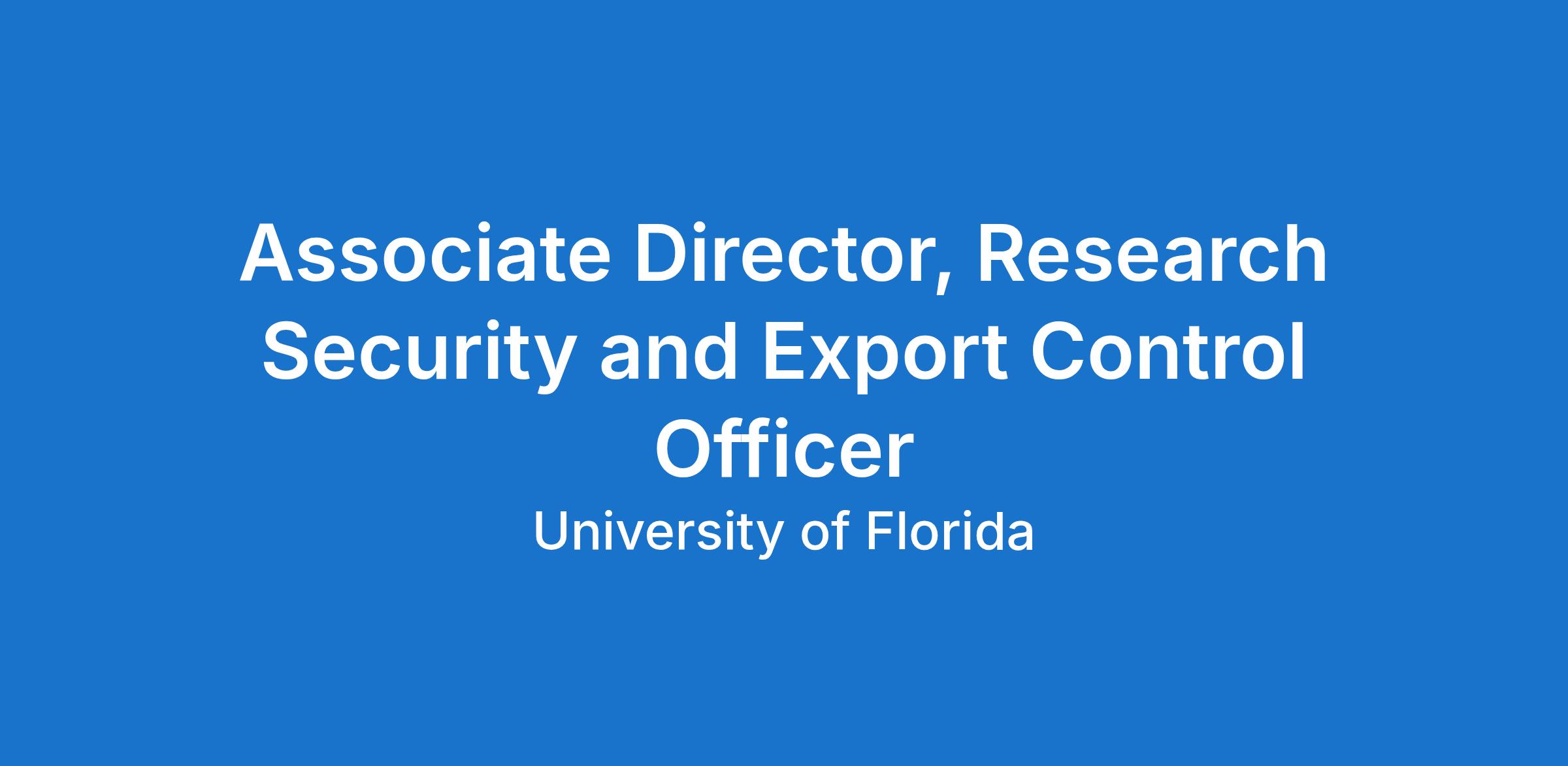 The Associate Director is a leadership position within UF Research and will serve as the University’s Empowered Official for export controls and oversee the development, implementation, and continuous improvement of UF’s research security and export control compliance programs. Reporting to the Senior Director, Research Integrity, Security & Compliance, the Associate Director will guide a forward-thinking, comprehensive research security and export control program that safeguards UF’s research enterprise while enabling international collaboration and innovation. This position ensures compliance with federal regulations including the International Traffic in Arms Regulations (ITAR), Export Administration Regulations (EAR), and Office of Foreign Assets Control (OFAC) sanctions, while promoting a culture of integrity, innovation, and global collaboration across UF’s research community. The role requires deep regulatory expertise, strong judgment, and a proactive approach to managing complex compliance matters that intersect with research security, academic research, and international engagement. Key Responsibilities Research Security Leadership