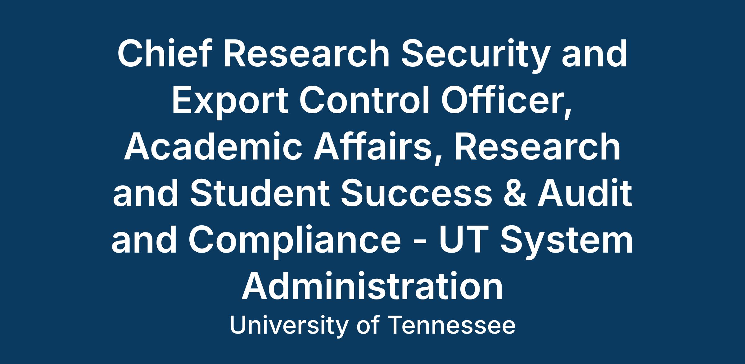 Reporting to the Associate Vice President for Research (AVPR) and the Executive Director of Institutional compliance (EDIC), the Chief Research Security and Export Control Officer (RSECO) is responsible for implementing and overseeing the University of Tennessee's Research Security and Export Control programs to ensure the integrity and security of the University's research by implementing and enforcing regulations related to export controls, foreign influence, research compliance, Financial Conflicts of Interest/Conflicts of Commitment, visiting scholars’ access to research and/or clinical facilities and resources, Responsible Stewardship of Research Data, and Responsible Conduct in Research, among others. The RSECO will work closely with campus and institute counterparts to promote and facilitate compliance with federal and state laws and regulations, federal sponsor requirements and guidelines, and the University’s policies and procedures governing research security and export control across research, academic and business activities. Additional, the RSECO will serve as the Export Control Officer for select campuses and institutes within the UT System.