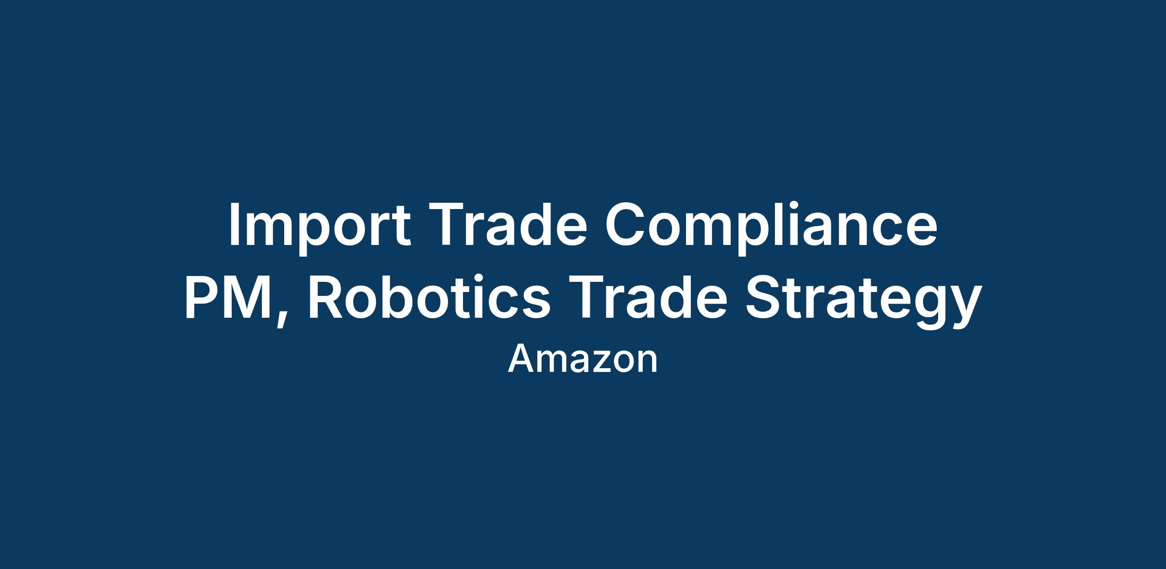 The Robotics Trade Strategy (RTS) team is looking for a talented Import Trade Compliance Program Manager with a strong delivery record and leadership experience to own and execute strategic, cross-functional projects.