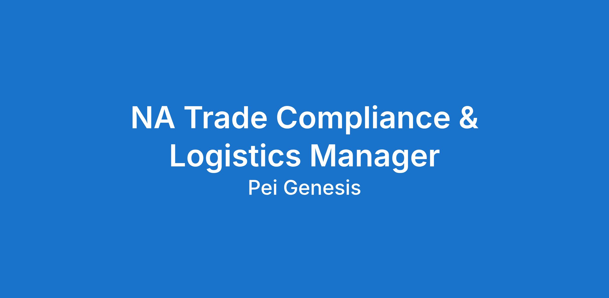 The Trade Compliance & Logistics Manager for North America will manage Trade Compliance and Logistics activities for PEI-Genesis Inc North America, while supporting globally through a cross functional team. They are responsible for the classification and clearance of import/export shipments in compliance with all respective Government regulations. Define the âhowâ and support the regional management to ensure adherence to regional Customs Laws and other applicable regulations as it relates to the PEI-Genesis importation and exportation of merchandise. Maintain good working relationships, cooperate, and liaise actively with Sales, Purchasing, Accounting, Order Administration Operations, and IT; other outside companies including freight forwarders, Customhouse brokers; government bodies and their representatives. Logistically this includes administering 3PL and 4PL programs, ensuring customs regulations are strictly followed, and aligning logistics decisions with PEI-Genesisâ overall business strategies and values.