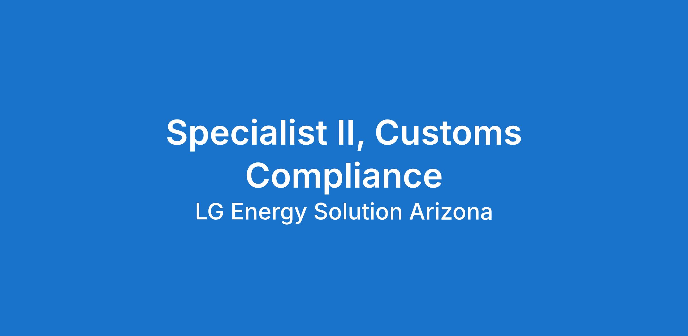 Job Summary: At LG Energy Solution Arizona, Inc., the Specialist II – Customs Compliance will play a key role in supporting U.S. import customs and Foreign Trade Zone (FTZ) operations to ensure regulatory compliance and efficient material flow. This role manages daily import activities, coordinates with customs brokers and freight forwarders, and maintains accurate import documentation and data in accordance with U.S. trade regulations. Working closely with internal stakeholders and global partners, the Specialist II helps ensure compliance with customs requirements while supporting the timely movement of materials across the supply chain.