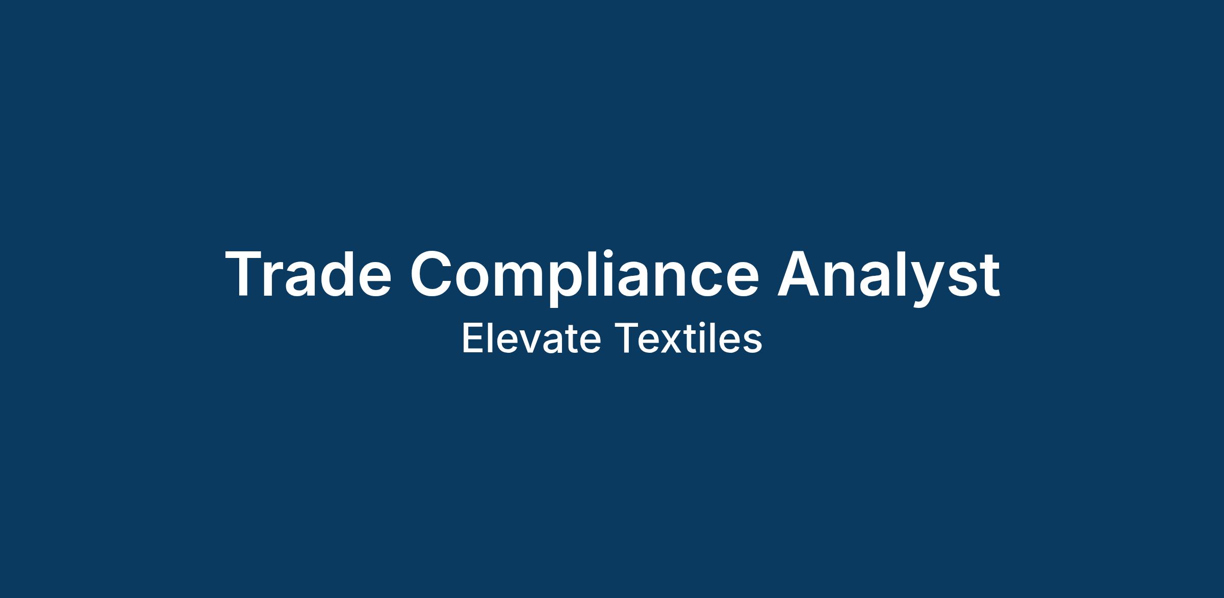 Elevate Textiles, a global provider of textile products and solutions, is looking to fill the position of Trade Compliance Analyst working with our global logistics team.ย The position is based out of the company's offices in Mount Holly, NC, outside of the metro Charlotte area.
